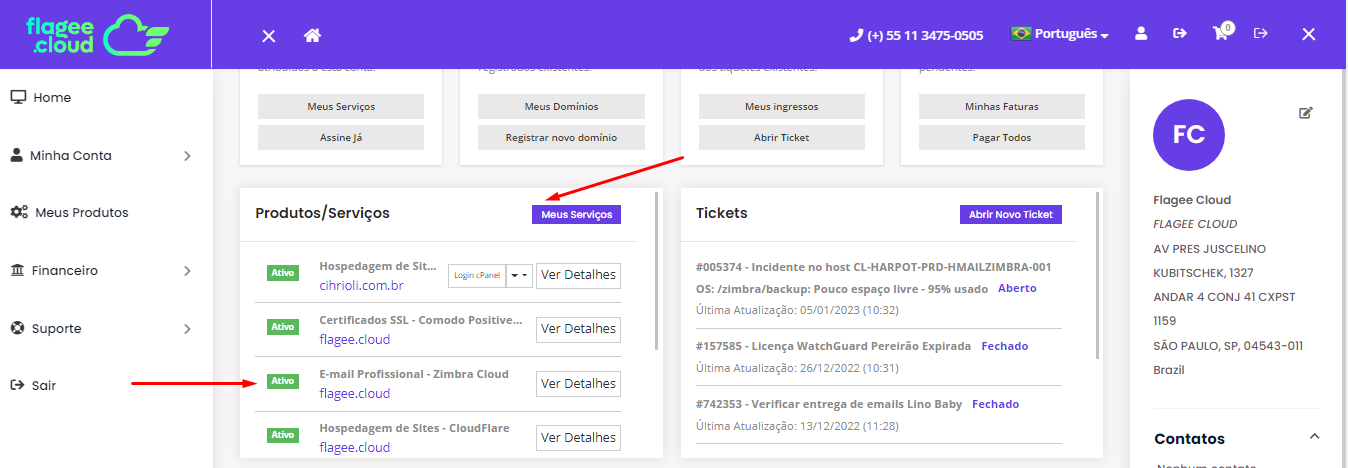 3. Localize em sua tela a opção Meus Serviços e encontre o serviço E-mail Profissional - Zimbra Cloud, após clique no botão Ver Detalhes.