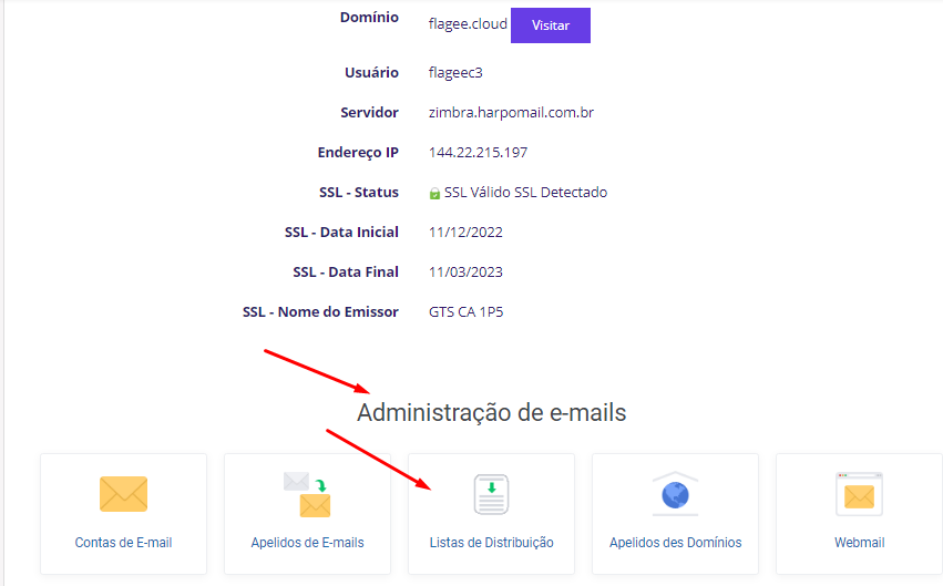 4. Ao visualizar a tela do serviço escolhido, encontre a opção Administração de e-mails, que fica ao final da página e clique sobre a opção Lista de distribuição.