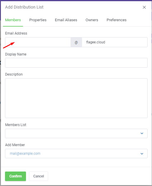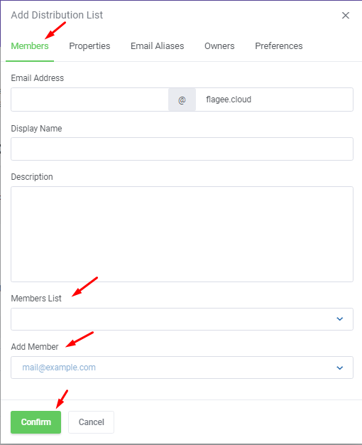 Na aba Members > Members List, ao digitar os contatos ele fará uma busca dos e-mails que já estão dentro deste domínio.