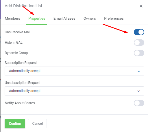 6: Na aba Members preencher o campo Email Address com o nome da lista e na segunda aba Poperties marcar a opção Cain Receive Mail.