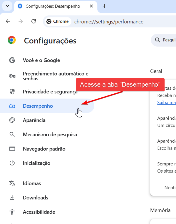 - No menu lateral, clique em Desempenho.