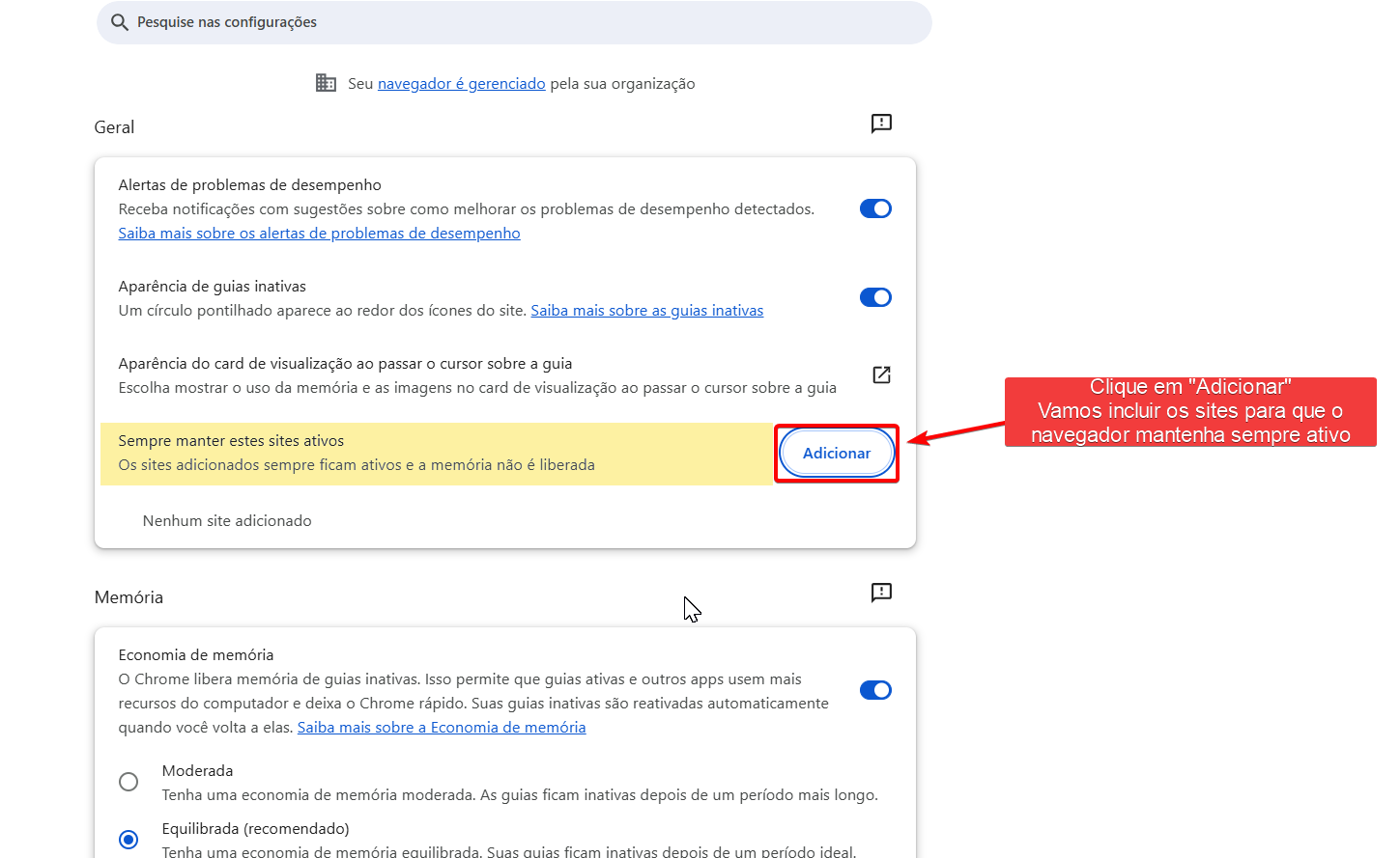 - Em “Sempre manter estes sites ativos”, clique em Adicionar.