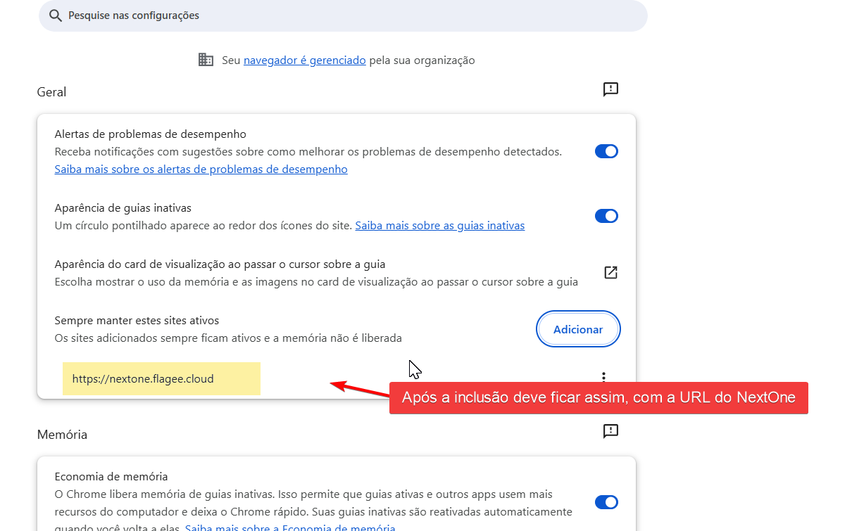 - Se preferir manter ligada, garanta que o NextOne esteja na lista de “Sempre manter estes sites ativos” (passo 1).