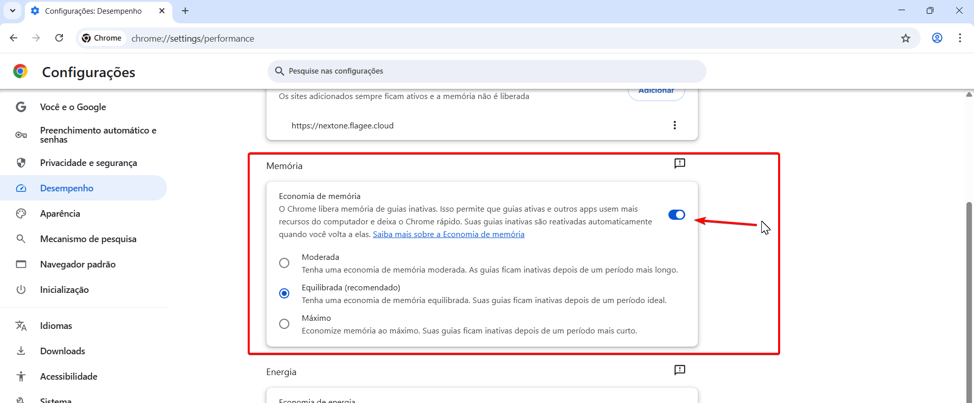 2) Ajustar a “Economia de memória” (Memory Saver)