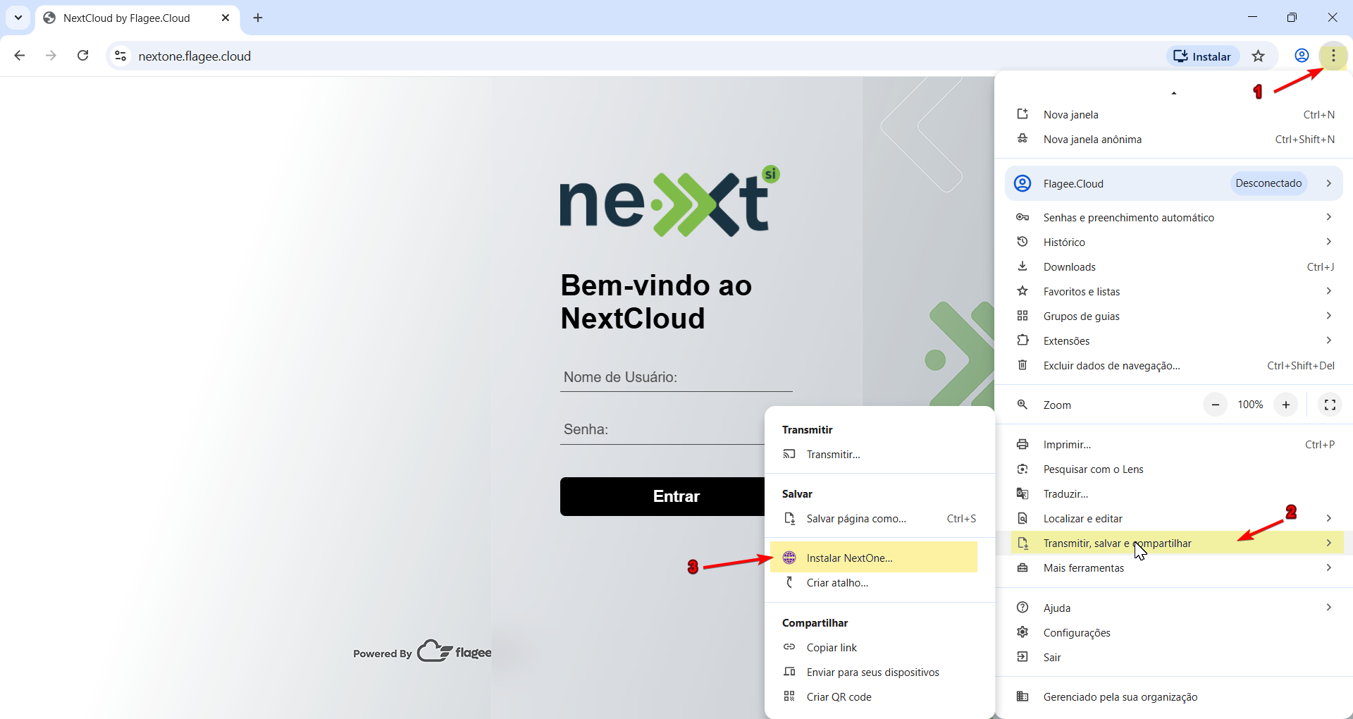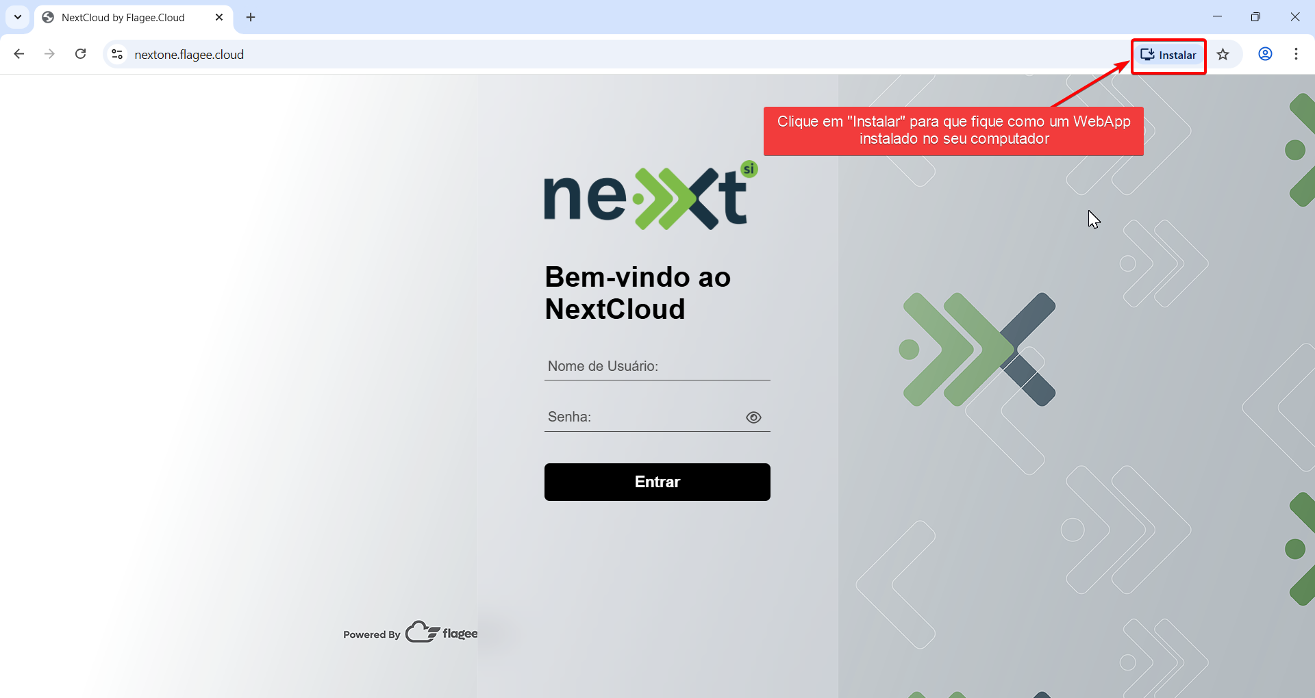 - Acesse https://nextone.flagee.cloud no Chrome.