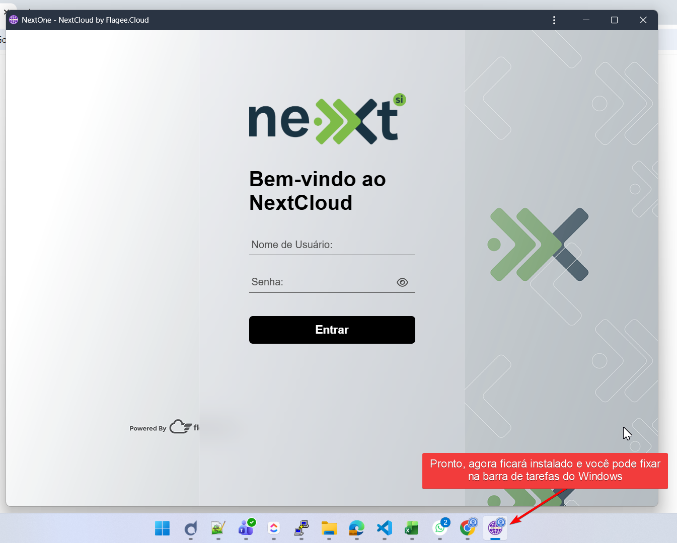 Por fim você verá que agora é criado um ícone exclusivo para o NextOne e você pode fixá-lo na barra de tarefas do Windows.