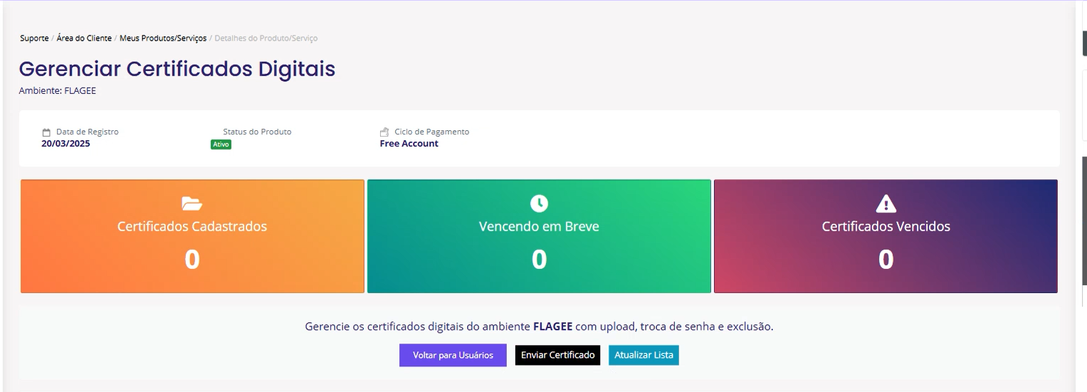 Você será direcionado para a página Gerenciar Certificados Digitais, onde ficará disponível o painel completo da funcionalidade.