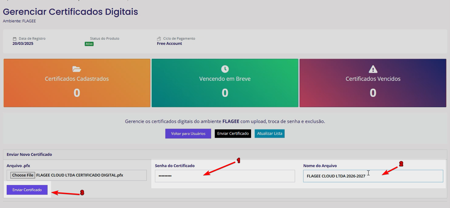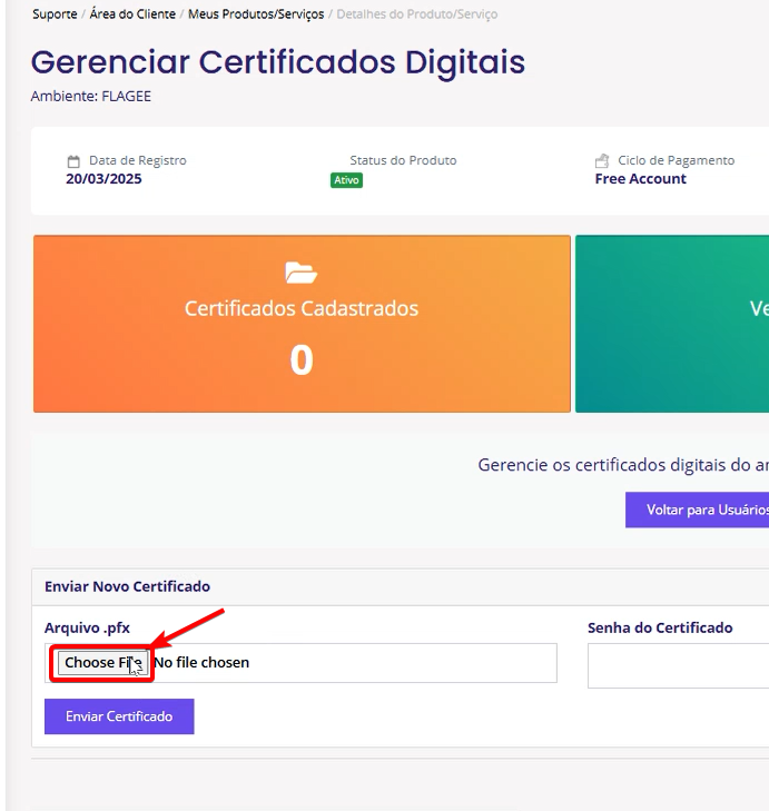 4. Depois de preencher os campos, clique em Enviar Certificado.