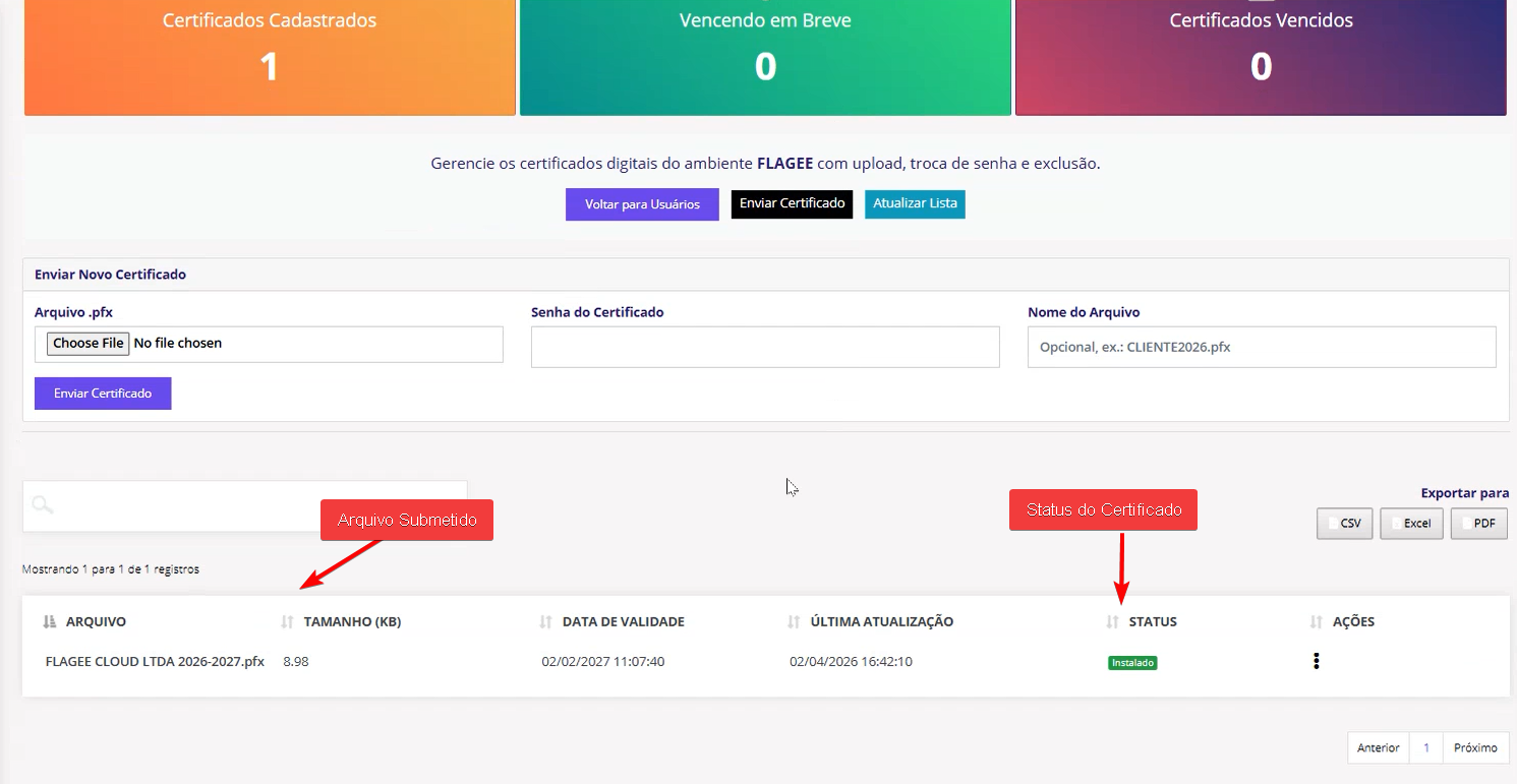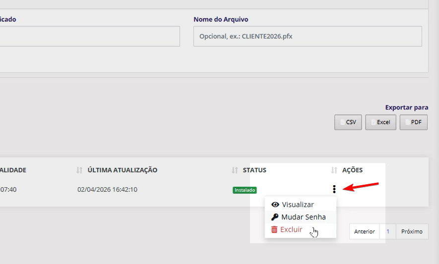 Essas opções permitem administrar o certificado já enviado sem precisar reenviar tudo novamente, quando aplicável.