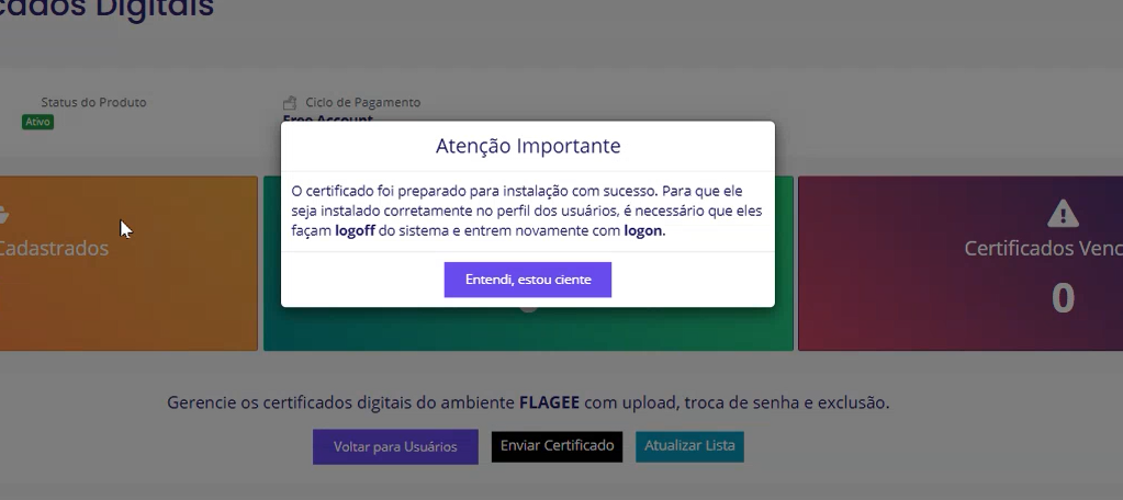 Isso força a atualização da listagem de certificados exibidos no painel.